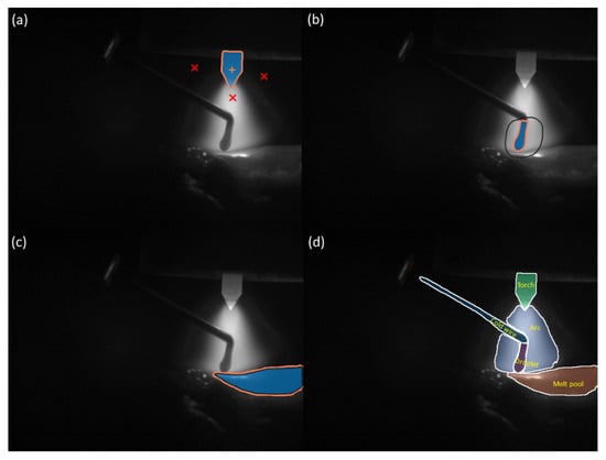 Figure 5a illustrates the process of segmenting target objects using the point prompt mode of the SAM. In this mode, segmentation is achieved by clicking on the target object with a mouse. Each mouse click updates the segmentation result. The pixels where the mouse is clicked are displayed with either a ‘+’ or ‘×’ symbol. A ‘+’ indicates a positive prompt, meaning that the point belongs to the target object. An ‘×’ indicates a negative prompt, meaning that the point does not belong to the object to be segmented. While objects with distinct boundaries, like tungsten electrodes, can be accurately segmented with one or a few clicks, objects with blurred boundaries, such as droplets and wires, may require multiple clicks or even fail to segment.