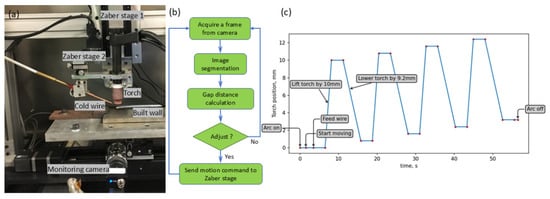 To assess the performance of our proposed closed-loop system, the CNC WAAM system was subjected to a controlled experiment. Zaber stage 1 was programmed to execute a predefined vertical motion profile, as illustrated in Figure 6c, which resulted in changes to the positions of both the TIG torch and the cold wire. Simultaneously, the closed-loop control programme adjusted Zaber stage 2 in response to real-time image feedback, thereby maintaining a constant distance between the cold wire tip and the melt pool. After the deposition starts, Zaber stage 1 will lift the torch and the cold wire first, remain stationary for 4 s, then proceed downward and remain stationary for a further 4 s. This intentional up-and-down process was repeated four times.