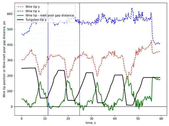 Figure 7 presents the curves representing the cold wire position, tungsten electrode tip position, and the distance between the cold wire and the melt pool during the vision-based closed-loop control of the cold wire position. Figure 8 demonstrates a part of the closed-loop control video, which consists of 60 consecutive frames. The time interval corresponding to Figure 8 is between the two blue vertical lines in Figure 7. These results demonstrate the effectiveness of the closed-loop control system for regulating the cold wire position. Figure 7 shows that there is a certain degree of hysteresis in the adjustment of the distance between the cold wire and the melt pool. This is because the cold wire undergoes a large position change in a very short time (e.g., rising or falling 10 mm in about 1 s). Zaber stage 1 can rise or fall at a speed of 9 mm/s, while the maximum speed of Zaber stage 2 can only reach 2 mm/s. Since such extreme conditions are not representative of typical WAAM operating conditions and Zaber stage 2 can be replaced with a faster stage, this hysteresis will not cause a problem. To be highlighted, the wire position control function in this paper is only validated by a fixed set of process parameters. More comprehensive wire position control study should be performed with the support of the proposed segmentation. The full video is available in Supplementary Materials.