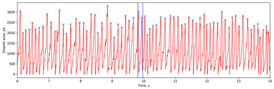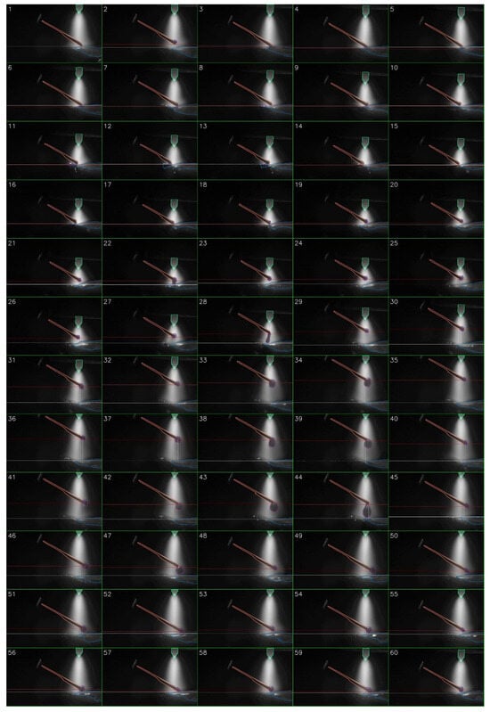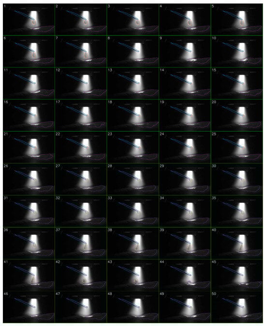 Figure 9 presents a 50-frame sequence extracted from a segmented monitoring video using our toolkit. The entire video, spanning ~17.8 s and 5660 frames, captures a single pass of the plasma deposition process. Subfigures 8 to 44 in Figure 9 illustrate the complete process of a droplet from its formation, growth, detachment, descent, and entry into the melt pool. The full video is available in Supplementary Materials. Figure 10 plots the droplet cross-sectional area (in pixels) over time. The maximum droplet cross-sectional area prior to melt pool entry is marked with an ‘×’ on the curve. Statistical analysis reveals 155 droplets in total during this process, with an average droplet falling frequency of 8.7 Hz. The time interval corresponding to Figure 9 is indicated between the two blue vertical lines in Figure 10.