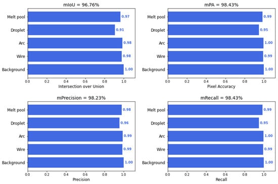 The model was developed using PyTorch v.2.7.0 and trained on a laptop with an Intel i9-13900H CPU and an NVIDIA GeForce RTX 4090 GPU. Training was performed using an input image size of 640 × 512 pixels, a batch size of 8, and a learning rate of 0.001. The model was trained for 120 epochs using the Adam optimizer and the Dice loss function. The training process took approximately 20 h. The trained model achieved a mean F1 score of over 0.95 and a mean Intersection over Union (mIoU) of over 0.96 on the test set (10% of the dataset). The metrics of trained U-net on the test dataset are shown in Figure 11.