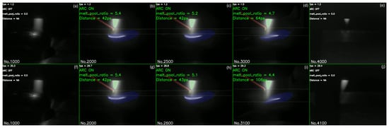 Dedicated model results on CPU (a–e) and GPU (f–j). The horizontal solid lines represent the cold wire height position and the melt pool position. The frame number of the current video frame is displayed in the bottom left corner. Video processing speed, arc status, the ratio of the molten pool cross-sectional area to the total image area and the distance between the cold wire and the molten pool are shown on top left.
