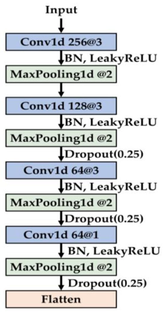 In the feature extraction module, a series of 1D convolutional layers is utilized to progressively extract informative features from the input data. Max pooling layers are employed to retain salient representations while reducing feature resolution and computational cost. At later stages, 1 × 1 convolutions are introduced to reorganize channel-wise information. To further enhance regularization, dropout with a rate of 0.25 is applied between convolutional blocks, helping to suppress overfitting. The detailed architecture of the feature extraction module is illustrated in Figure 1.