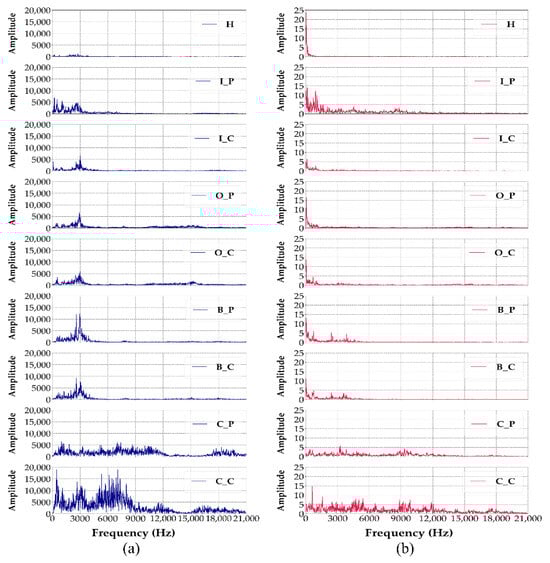 FFT power spectra of sensor signals in nine different bearing conditions: (a) vibration sensor, (b) acoustic sensor.