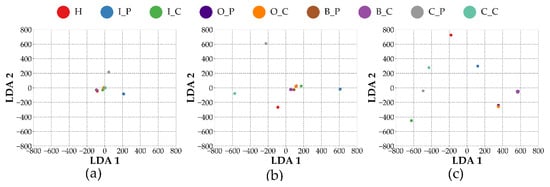 LDA projection of feature representations from different model configurations. (a) ACO, (b) VIB, and (c) VAF.