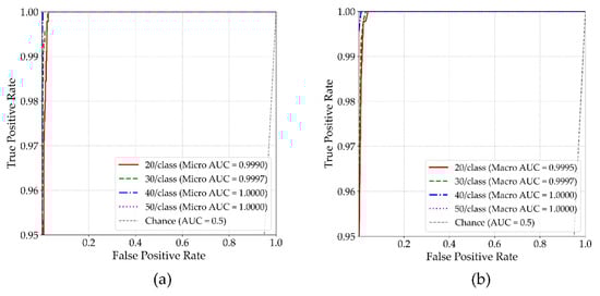 As shown in Figure 6, MSFF-Net consistently maintains high classification reliability across varying training sample sizes, as evidenced by both micro- and macro-averaged ROC curves. Although slight reductions in AUC are observed at 30 and 20 samples per class, all values remain above 0.9990, indicating negligible performance degradation. The near-identical shapes of the two curves further suggest that both global recognition capability and class-level consistency are well preserved. These findings suggest that even under limited-data conditions, the model remains robust under limited-data conditions and is resilient to potential class imbalance effects, without exhibiting significant deterioration in class-specific performance.