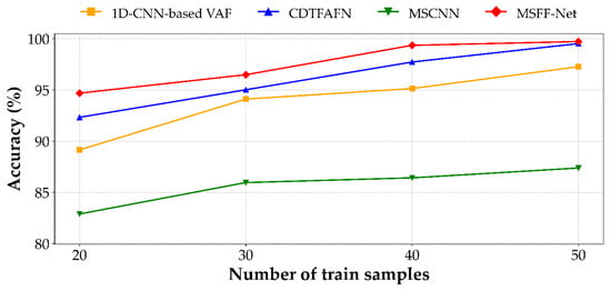 Compared to the other 1D CNN-based model, MSFF-Net not only achieves superior performance under full-data conditions but also exhibits greater robustness as the amount of training data decreases. Between 50 and 20 samples per class, MSFF-Net’s classification accuracy declines by 5.04%p, whereas the 1D-CNN-based VAF model shows a more pronounced drop of 8.12%p. Although CDTFAFN performs competitively when ample training data is available, its accuracy decreases by 7.20%p under data-scarce conditions, which may be attributed to its dependence on complex time–frequency transformations and multi-scale fusion mechanisms. While MSCNN maintains relatively stable performance at higher sample sizes, its accuracy drops by 4.49%p between 30 and 20 samples per class, resulting in an 11.8%p performance gap compared to MSFF-Net in the most limited-data setting.