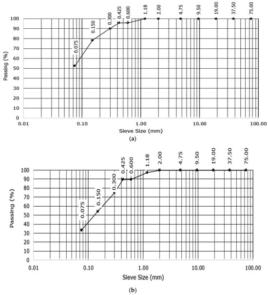 Figure 3 displays the findings from the sieve analysis of the Ivrogbo and Oleh samples. The particle diameter of the Oleh specimen was 0.6 mm, whereas the diameter of the Ivrogbo sample was 0.3 mm, as the diameter is defined as the diameter for which the percentage passing in the sieve analysis is 90%. Figure 4 displays the test output graph for the Atterberg limit test results for the soil samples from Ivrogbo and Oleh. For both the Ivrogbo and Oleh soil samples, the bulk density test produced an average bulk density of 1.64 g/cm3, as shown in Table 1. Aggregation includes enhanced resistance to compaction and particle adhesion. The bulk density of sandy soil is normally 1.50–1.70 g/cm3. Consequently, porosity ranges from 0.43 to 0.36. The bulk density of clay soil is normally between 1.1 and 1.3 g/cm3. As a result, the porosity ranges between 0.58 and 0.51. Based on the bulk density of 1.64 g/cm3, the porosity of the soil samples from Ivrogbo and Oleh was determined to be 0.36. According to the American Association of State Highway and Transportation Officials (AASHTO) and the Unified Soil Classification System (USCS) [,], the Oleh test material was a sand–clay mixture, whereas the Ivrogbo test sample was identified as silty clay with low-to-medium plasticity based on the sieve analysis and the gaseous analysis (Table 2).