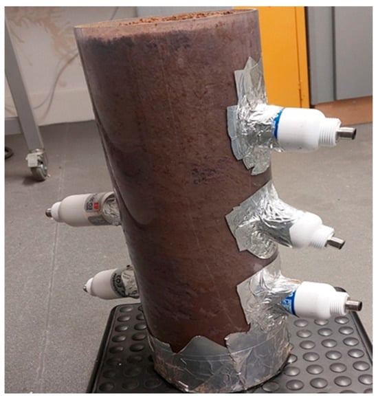 In the inland valley of the Nigerian Niger Delta region, two monoliths of undisturbed soil samples were collected from fallow areas using the method of []. One was from Ivrogbo, close to a branch of the Niger River (5.41872 N, 6.34359 E). which had been used for agriculture in one form or another for over 15 years. However, when the sample for the experiment was taken, it was covered in weeds. The other was taken from a farm garden in Oleh (5.46186 N, 6.20624 E) that was left fallow and weed-grown at the time the experiment sample was taken. This area had also been used for agricultural purposes in one way or another for more than 20 years. The two areas have an equatorial climate with two distinct seasons and heavy humidity and rainfall for the majority of the year. To make the land cultivable all year round, however, an irrigation program outlined in this paper can be used throughout the dry season. Weeds were removed from the top in both cases, and core samples were collected using cylindrical PVC pipes with internal diameters of 101.6 mm and heights of 400 mm. The samples were then taken to the laboratory for initial sieve analysis in order to ascertain the bulk density, Atterberg limits, and soil particle size. Figure 3 and Figure 4 display the specifics of the initial investigation. At Robert Gordon University in the Garthdee neighbourhood of Aberdeen, United Kingdom (56.123136 N, 2.134911 W), a third soil column experiment sample was collected from a garden close to the River Dee. The region has an oceanic climate with extremely cold temperatures throughout the year. However, it has four clearly defined seasons of summer in June, autumn in September, winter in December, and spring in March. Based on the grain size distribution, it was determined to be silty sand. The sample was damp-packed [,] in a transparent acrylic PVC cylindrical pipe that was 400 mm high and had an internal diameter of 139.7 mm. The pipes in all the cases had 45 mm diameter holes that were drilled vertically downward at 100 mm intervals for the placement of sensors in the laboratory, as shown in Figure 5. This process involves mechanically packing small volumes of damp soils into the soil column []. After drying for about six months in the laboratory under standard pressure and temperature settings, the same packed soil sample from Aberdeen was disrupted to simulate ploughing in the fourth experiment because repeating the experiment immediately after the first run generated a matric potential very close to saturation, with a very high water content. Furthermore, preferential flow would be established if dried in the natural environment, because the structure of the matrix would also change.