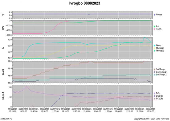 The experiment’s data logging and monitoring were conducted using a GP2 Data Logger and Controller, a research-grade logger with intricate computed measurements and advanced feedback control. Pre-installed software on the PC was used to communicate with the data logger using the DeltaLINK 3.9 program software, which is a product of Delta-T Devices. A dataset import wizard was also installed on the computer in order to import DataLink datasets into a 32-bit Microsoft Excel spreadsheet. The dataset window was used to obtain and display all the data that had been saved in the GP2 data logger. When the dataset import wizard was used, these could be edited to open in Excel. They were saved to a PC dataset file. In order to record the soil water content, or θ, the data logger was connected to the sensors positioned in the soil column and connected to a PC running DeltaLINK version 3.9. This specific sensor, a multi-parameter Delta-T Devices Ltd., Cambridge, UK WET150 sensor, was suitable for usage in growing media such as soils and substrates. Over the whole range of 0 to 100%, the sensor converted the measured dielectric properties into water content with the greatest accuracy of ±3%. It also raised the bulk conductivity of the soil from 0 to 500 mS/m to 100%. The WET150 sensor measured the bulk electrical conductivity of soil (ECb) over a range of 0 to 2000 mS/m, with the best accuracy between 0 and 1200 mS/m ± (10 mS/m + 6%). It also calculated the electrical conductivity of the water contained in the soil’s pores, or pore water conductivity (ECp). As a result, the WET150 could be used with any third-party SDI-12-compliant logging or metering device, such as the Delta-T Devices UK GP2 data logger used in the experiment. An Equitensiometer (EQ3) sensor, which detects soil matric potential and temperature, was the main component of the soil matric potential recording system. The negative pressure, commonly known as suction, needed to extract water from the gaps between soil particles is known as the soil matric potential Ψ and has units of pressure, kPa. Numerous elements, including gravity, air pressure, osmosis, and the capillary action of soil particles, affect the water potential. The final component, called the soil matric potential Ψm, is highly dependent on the soil’s moisture content and ranges from 0 kPa at field capacity to about −1500 kPa at the permanent wilting point. It is an important indicator of plant water stress. The amount of water present and the makeup of the soil affect the observed value of the soil matric potential; however, temperature and salinity also play a role.