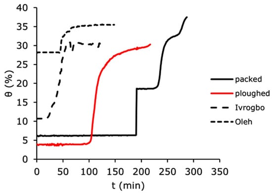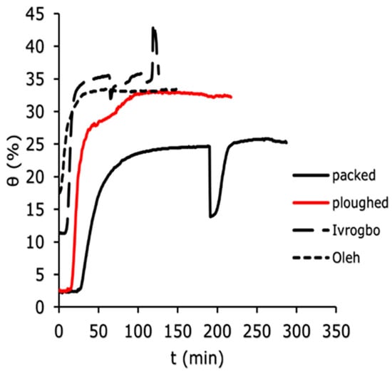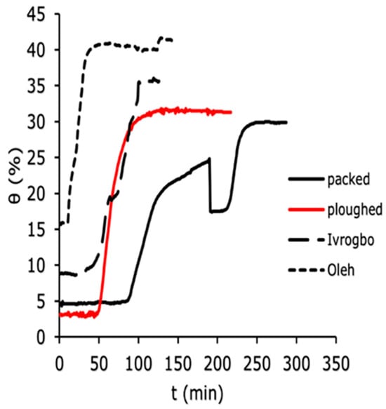 The soil water content was measured using the WET150 at 100 mm depth, 200 mm depth, and 300 mm depth vertically down the soil column for the four soil samples (Ivrogbo, Oleh, packed and ploughed Aberdeen soil specimen). The WET150 sensor automatically recorded the initial water content of each sample at the position where the sensor was placed at the beginning of the logging. Figure 7, Figure 8 and Figure 9 show the domain-specific soil water content at 100 mm depth for the ploughed, packed, Oleh, and Ivrogbo soil samples. With 17.5% water content at 100 mm depth, the Oleh soil sample was found to be the wettest prior to the experiment, whereas the Ivrogbo sample had 11.3%. The water content of the Aberdeen packed and ploughed samples was ca. 2.5 percent. However, as the infiltration tests progressed, it was found that every soil sample reached a constant water level, with the Aberdeen packed sample having the lowest water content and the Ivrogbo sample having the highest. Soil properties, including texture and structure, control size distribution, which in turn controls total water storage, available water holding capacity, and water circulation in the soil. Although changing the texture of the soil usually does not result in better plant–water connections, adding organic matter to the soil can enhance meso- and macro-porosity, which helps with free drainage and increases the amount of water that plants can hold. Understanding how soil and water interact is crucial for the majority of land use decisions []. For example, the Oleh sample had 33.2% water content at 100 min into the trial, whereas the Ivrogbo soil sample had 35.7% water content. The water content of the ploughed sample was 32.7%, whereas the water content of the packed sample was 23.6%. This was because the packed sample’s silty sand texture made it coarse-grained, but the Ivrogbo soil’s silty clay with low-to-medium plasticity texture rendered it fine-grained. Although sandy soils have lower accessible water values, fine-grained soils have more available water due to their larger pore count []. Because the ploughed sample had become finer-grained after the stones were removed from the packed sample, it was found to have a higher water content than the packed sample. After 110 min, it was observed that the Oleh, Ivrogbo, ploughed, and packed samples had the highest and lowest water contents, respectively, at a depth of 200 mm. At a depth of 300 mm, the same order of magnitude was visible. It demonstrated that, at that section, the Oleh sample had finer grains than the Ivrogbo sample vertically downward. It was found that repeating the infiltration experiments and calculating the average values for the matric potential and soil water content for the several runs on each sample was not appropriate in this investigation. It is evident that the clay concentration of the Ivrogbo and Oleh soils causes them to solidify when dried after the initial run.