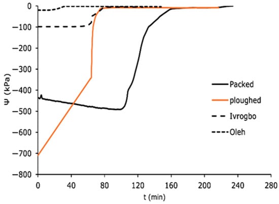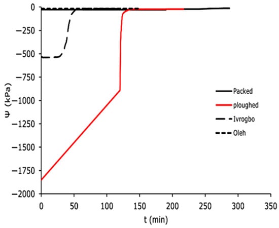 The domain-specific profiles for the matric potential for the packed soil sample, the ploughed soil sample, the Ivrogbo soil sample, and the Oleh soil sample at 200 mm depth and at 300 mm depth are shown in Figure 10 and Figure 11. Because the ploughed soil sample was initially drier than the packed soil sample, it had a higher negative matric potential at 200 mm depth, but within the first 90 min, it decreased to about −8 kPa from −710 kPa, giving a slope of roughly 7.8 kPa/min, and the packed sample increased from −436 kPa to −490 kPa, giving a negative slope of −0.6 kPa/min. Both samples had low Reynolds numbers under laminar flow conditions. However, when the stones were removed from the packed sample to create the ploughed sample, the soil texture changed. The ploughed sample became siltier, more uniform, and had a larger field capacity, whereas the packed sample became sandier. Under the same laminar flow circumstances, this caused the ploughed sample’s matric potential to fall more quickly than that of the packed sample. It was found that the packed sample took almost 200 min to reach a stable matric potential, but the ploughed sample reached a constant value in roughly 90 min. Although their laminar flow conditions were identical, the pre-experiment soil in Oleh was wetter. However, in 90 min, with a gradient of 0.95, the matric potential of the Ivrogbo soil dropped from −98.2 kPa to −4.6 kPa before stabilising, while in 90 min with a gradient of 0.2, the matric potential of the Oleh soil dropped from −20.1 kPa to −2.2 kPa before stabilising. The ploughed soil sample was instantly at the permanent wilting threshold with a matric potential of −1850 kPa, whereas the packed soil sample had an initial matric potential of −28.1 kPa at 300 mm deep (Figure 11). Furthermore, the Ivrogbo soil sample began at −539.2 kPa, whereas the Oleh soil sample began at −19.3 kPa. After 125 min, their matric potentials were compared, and it was discovered that the ploughed soil sample’s matric potential had decreased with a gradient of about 14, while the packed soil sample’s gradient was negative at −0.0088. With a gradient of 4, the matric potential of the Ivrogbo soil sample dropped from −539.2 kPa to −17.4 kPa, whereas the matric potential of the Oleh soil sample dropped from −19.3 kPa to −17.4 kPa with a gradient of 0.02. As a result, there was agreement between the matric potential profiles of the 200 mm depth and the 300 mm depth. This demonstrated that the kind or texture of the soil had an impact on the profile of the soil matric potential when water was added [,,,]. This study found that the packed soil, which was assumed to be silty sand, was less silty than the ploughed soil. The Oleh soil sample’s sand–clay blend had the greatest field capacity. Next came the Ivrogbo soil sample, which is a blend of silty clay with low-to-medium plasticity, the ploughed soil sample, and finally, the packed soil sample. As also mentioned in [], it showed that the soil samples with fine-grained textures had a greater field capacity than the soil samples with coarse-grained textures.