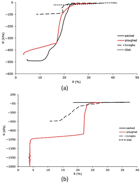 During the infiltration experiments of the different soil samples—that is, the packed soil sample, the ploughed soil sample, the Ivrogbo sample, and the Oleh sample—the relationship between the soil water contents and the soil matric potentials was plotted for 200 mm and 300 mm depths and compared, as shown in Figure 12. Furthermore, a comparison was made between the model of the van Genuchten curve and the soil water characteristic curve at a depth of 200 mm, as presented in Figure 13 and Figure 14. The soil water characteristic curves of unsaturated soils are greatly influenced by a number of variables, such as particle size, pore structure, initial water content, soil dry density, and soil texture []. Higher available water values are found in fine-textured soils, whereas lower available water values are found in sandy soils [,]. Even though the four soil types were exposed to similar laminar flow conditions, Figure 12a shows that their soil water characteristic curves differed significantly at a depth of 200 mm. While the Ivrogbo soil sample’s soil water content increased from 8.8% at a matric potential of −98 kPa to 35.3% at a matric potential of −4.4 kPa over a range of approximately 100 min, the packed soil sample’s soil water content increased from 4.7% at a matric potential of −436.5 kPa to 11.2%, but the matric potential increased to −485.2 kPa. This was due to the fact that the Ivrogbo soil had a finer grain size and a greater capacity to hold water than the packed soil sample, which had coarser grains. In contrast, the ploughed soil sample’s soil water content rose to 30.4% at a matric potential of −7.9 kPa from 3.1% at a matric potential of −710 kPa. This was due to the fact that the removal of stones and ploughing of the soil changed the texture of the soil and made the grains finer, which increased the soil’s capacity to store water. Because of the fine-grained clay composition and the fact that the sample was already extremely wet prior to the experiment, the Oleh soil sample’s soil water content rose from 15.9% at a matric potential of −20.1 kPa to 40.3% at a matric potential of −2.6 kPa. In Figure 12b, the same pattern was observed at a depth of 300 mm. While the packed sample’s water content increased from 6.1% at a matric potential of −28.1 kPa to a water content of 6.2% with the matric potential having increased to −29.2 kPa, the Ivrogbo soil sample’s water content increased from 10.8% at a matric potential of −539.2 kPa to 30% at a matric potential of −17.5 kPa in 130 min. This was due to the fact that the packed sample was fine-grained, which improved its water-holding capacity, while the latter was coarse-grained. With a matric potential of −1850 kPa and a water content of 4%, the ploughed soil sample was initially at the permanent wilting point. However, over the same time period, the water content rose to 23.8% at a matric potential of −58.8 kPa because the texture changed due to the removal of stones and the ploughing conditions, and its water-holding capacity increased as well. Due to the fine-grained sand–clay mixture and pre-experiment moisture, the water content of the Oleh soil sample rose from 28.2% at a matric potential of −19.3 kPa to 35.5% at a matric potential of −16.8 kPa at a depth of 300 mm.