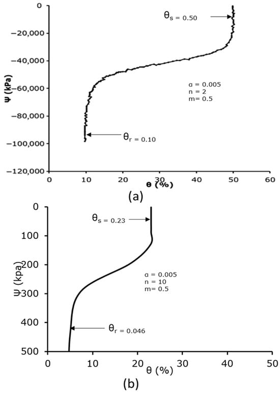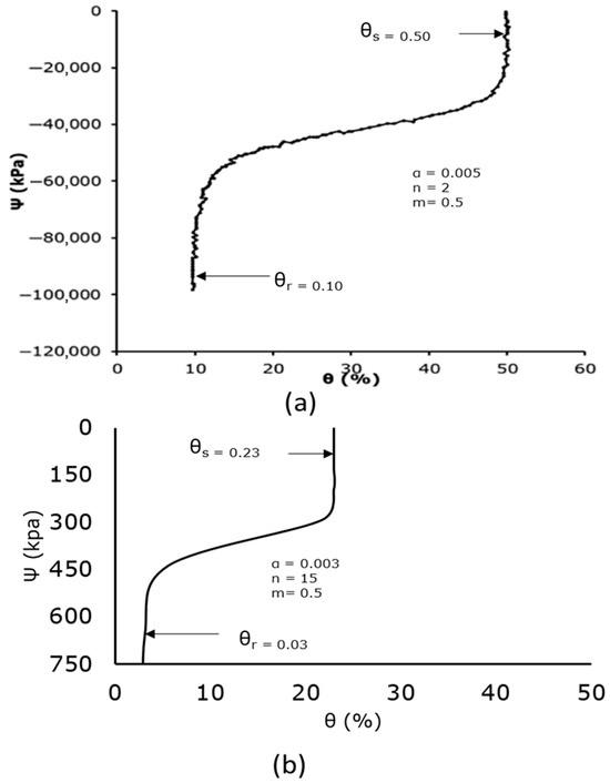 Van Genuchten (1980) suggested a method based on fitting soil water characteristic data using van Genuchten’s (1980) equation []. The van Genuchten (1980) equation [] for the soil water characteristic of unsaturated soils is presented in the following equation: