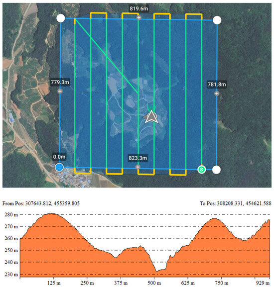 The flight was conducted considering the terrain characteristics of the study area (altitude range approximately 237–277 m), with the flight altitude set to 150 m to avoid surrounding obstacles such as power lines (Figure 2). The UAV’s speed was set to 10 m/s, and the camera angle was fixed at −90° (vertical to the ground) to maximize the vertical accuracy of the LiDAR point cloud (See Table 1).