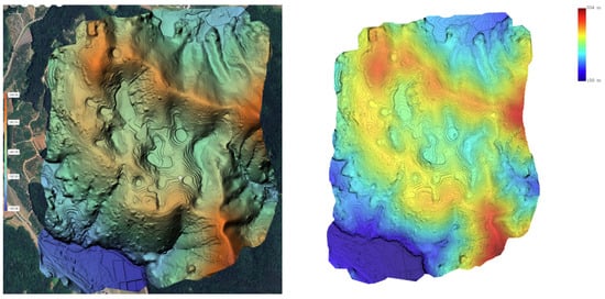 The UAV LiDAR-based DEM generated in this study, with a resolution of 0.25 m and an average point density of 98 pts/m2, allowed for highly detailed topographic representation. When compared to the DEM derived from the national basic map, the UAV LiDAR-based DEM provided a clearer visualization of fine topographic features, such as the boundaries, shapes, and depths of the dolines. Particularly in areas with dense vegetation, the UAV LiDAR effectively captured the ground surface, overcoming the resolution limitations of the traditional contour-based DEM (see Figure 4).
