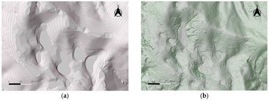 Shaded relief map and 5 m contour lines generated from 1:500 digital topographic map (a); shaded relief map and 0.25 m contour lines generated from UAV LiDAR (b).
