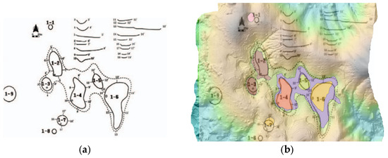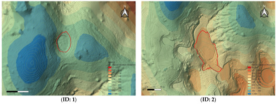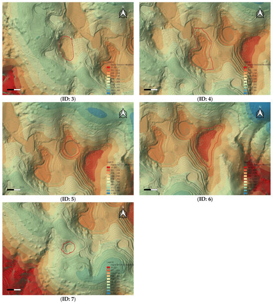 The comparison of UAV LiDAR-based detection results with a previous field survey conducted in 2013 [18], which utilized a 1:5000-scale national basic digital elevation model, revealed that seven out of the nine dolines reported at that time were clearly identified in the present study. The DEM from the 2013 study was constructed based on contour data extracted from the National Basic Map V2.0, allowing for a historical comparison despite its lower spatial resolution. The remaining two dolines may have been altered due to external factors such as cultivation, erosion, and terrain changes, or it is possible that detection errors occurred due to the low resolution of the existing data (see Figure 6 and Figure 7).