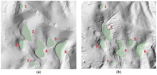 Comparison of each doline (ID: 1–7) between contour-based mapping (a); UAV LiDAR detection (b) (the green polygon is the results of a survey conducted in 2013).