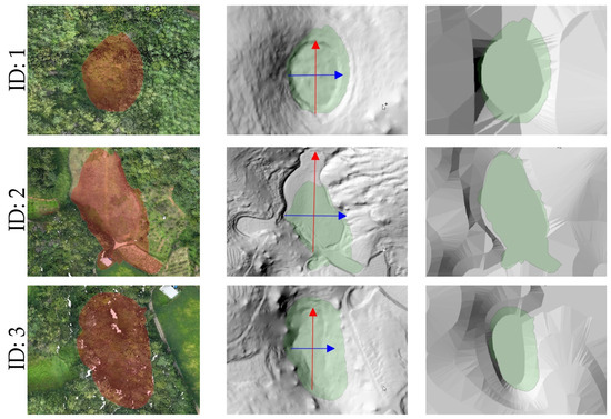 Comparison of RGB point cloud with doline boundaries (left), shaded relief map generated from UAV LiDAR (center), and shaded relief map based on the 1:5000-scale topographic map (right). (Blue line is x-axis, red line is y-axis, and the red and green polygons are the results of a survey conducted in 2013.)