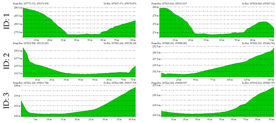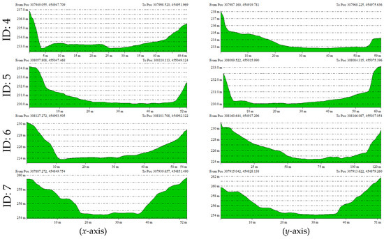 Using the UAV LiDAR-based DEM, elevation profiles in both the X and Y axes were extracted for each doline and analyzed (Figure 9). The elevation profiles are useful for understanding the depth, slope morphology, and symmetry of each doline, allowing for a visual analysis of the developmental characteristics and subsidence structures of the terrain (Figure 10).