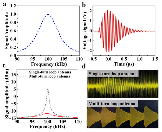 The receiving subsystem employed a 0.3 m commercial ultra-wideband loop antenna with a flat 90–110 kHz response. Simulations revealed critical reception parameters as shown in Figure 4c,d. Resonant loops enhanced signal strength non-uniformly, peaking at 100 kHz and tapering toward band edges. While five-turn loops achieved strong amplification, their narrow 2 kHz bandwidth caused problematic signal tailing, as shown in Figure 4c, the gray shadow. Three-turn configurations provided optimal balance, delivering 100-fold amplification with 5 kHz bandwidth (the pink shadow). Dimensional analysis showed maximum performance when resonant loops matched the receiver’s 0.3 m size, as the concentrated near-field flux and Lenz’s law effects maximized voltage induction. These findings guided the final design selection of a 0.3 m, three-turn resonant loop that optimally balanced amplification and bandwidth requirements.