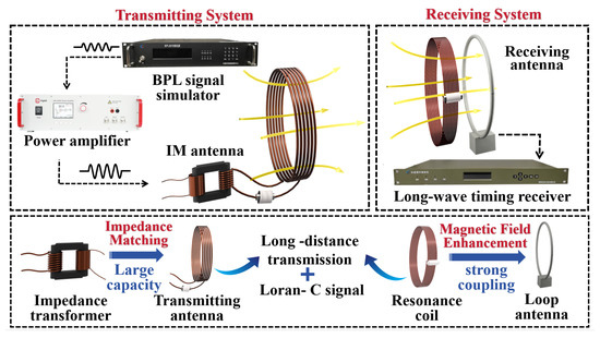 To overcome these inherent limitations while achieving system miniaturization, the proposed Loran-C timing system operates on the principle of near-field magnetic coupling, where the modulated Loran-C magnetic signal is radiated by the transmitting coil and induces detectable current in the receiving coil, as illustrated in Figure 2. Unlike conventional magnetic induction systems, this design incorporates a transformer-based impedance matching network at the transmitter to enable efficient high-current excitation of the radiating coil, enhancing the magnetic field intensity by over an order of magnitude. At the receiver side, a resonant coupling loop provides simultaneous bandpass filtering and signal amplification, improving both signal quality and operational distance. The system comprises a transmitter section with a BeiDou long-range precision Loran (BPL) signal generator producing accurate Loran-C waveforms that are amplified and fed into the impedance-matched antenna, and a receiver section where the coupled magnetic signals are captured and processed by a precision long-wave timing receiver for time information decoding. This optimized near-field coupling approach achieves substantial size reduction while preserving the critical timing synchronization capabilities characteristic of Loran-C systems, demonstrating the feasibility of miniaturized implementations without compromising performance.