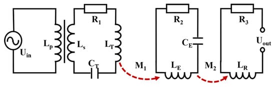where μ0 is permeability, I is current in the transmitting coil, and x is axial distance. The magnetic field generated by the transmitting antenna decays with the cube of distance (r3); as a result, a resonant coil is implemented at the receiver to enhance magnetic field intensity. The enhanced field strength M2 relates to the original field M1 through magnetic coupling [21,22,23]: