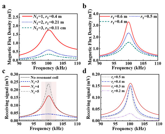 Magnetic flux density of the transmitting coil with different (a) number of turns and (b) radius. And receiving signal with different (c) turns and (d) radius of resonant coil.