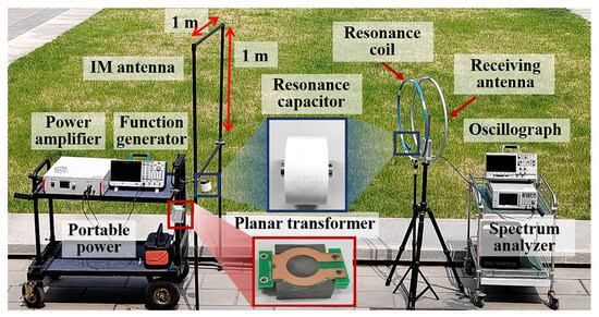 Based on the simulation results, antenna prototypes were fabricated as shown in Figure 5. The transmitting coil was designed as a 1 m × 1 m square loop, exhibiting similar electromagnetic characteristics to a circular loop with 0.56 m radius. The measured inductance of the antenna was approximately 3.91 μH, matched with 648 nF capacitors for optimal resonance. The resonant point impedance of the antenna is approximately 0.05 Ω, requiring impedance matching to interface with the power amplifier’s 2.5 Ω output. To achieve this, an impedance-matching transformer with a turns ratio of 7:1 (Np:Ns) was implemented. For magnetic field enhancement, a 3-turn resonant loop with 30 cm radius was constructed using 150 nF tuning capacitors according to simulation. An outdoor testbed was established to evaluate the antenna performance. The transmission system consisted of: A function generator producing standard Loran-C pulse signals, an ATA-3090C power amplifier (1000 W output power, 20 Ap current, 50 Vp voltage), and an oscilloscope monitoring the antenna’s input voltage and current. The receiving system employed: a miniaturized active loop antenna (0.3 m radius), an oscilloscope capturing the induced voltage.