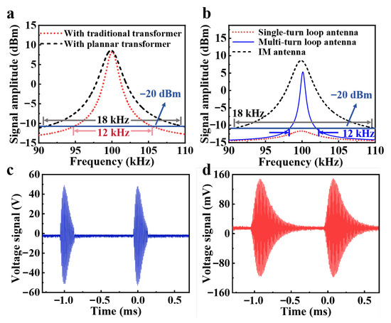 (a) The signal spectrum of the IM antenna using different transformers. (b) Signal spectrum of the IM antenna and the traditional loop antenna. Comparison of (c) transmitting signal and (d) receiving signal.