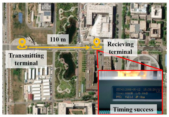 To validate long-range timing performance, a complete miniaturized Loran-C system was tested in open-field conditions as depicted in Figure 7. The BPL signal simulator encoded the date “2008.05.12” by using the Loran-C signal, while the long-wave timing receiver was initialized to “2000.01.01”. Successful time transfer was confirmed when the receiver synchronized to the transmitted date. At a transmission distance of 100 m, the system demonstrated excellent performance characteristics: it achieved rapid signal acquisition within seconds (faster than conventional miniaturized antenna transmissions), maintained completely error-free data decoding, and exhibited stable long-term synchronization capability throughout the testing period. Notably, the power amplifier in this configuration delivers approximately 100 W of output power. This performance represents a significant improvement over conventional alternatives: under identical power conditions, a similarly sized loop antenna without IM or MC technology achieves only 30 m effective decoding distance. The implementation of IM alone extends this range to 60 m, while the complete system with IM and MC technology exceeds 100 m, delivering a 3-fold enhancement in transmission distance compared to traditional designs. According to Equation (2), higher power input may enable additional extension of the timing signal’s effective range. These results collectively validate the system’s operational reliability and superior timing performance compared to traditional implementations. These experimental results verify that the miniaturized design maintains all critical Loran-C timing functionalities while dramatically reducing physical dimensions.