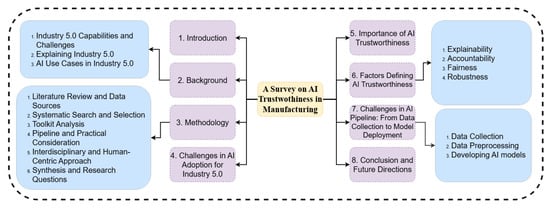 The structure of this paper, illustrated in Figure 1, is organised into eight sections, each addressing a critical dimension of AI trustworthiness in the context of Industry 5.0. Section 2 provides the background, tracing the evolution from Industry 4.0 to Industry 5.0 and emphasising the shift toward human-centricity, sustainability, and ethical integration. It further details the collaborative nature of Industry 5.0 and enumerates practical AI use cases in manufacturing, such as digital twins, predictive maintenance, and generative design. This section sets the stage for addressing the first research question: What is the role of AI in the transition from Industry 4.0 to Industry 5.0, and what are the associated challenges? Section 3 outlines the multi-stage methodology, encompassing a literature review, systematic search and selection, toolkit analysis, and an interdisciplinary, human-centric approach to synthesising research questions. This section establishes the methods used to explore the research questions and address AI adoption challenges in manufacturing. Section 4 examines the challenges in AI adoption for Industry 5.0, including technical, organisational, and ethical barriers like black-box models, data bias, reliability, regulatory concerns, security threats, and workforce adaptation. This section directly addresses the second part of the first research question: What are the technical, ethical, and organisational challenges of AI adoption in manufacturing? Section 5 discusses the importance of AI trustworthiness, drawing on real-world failures to highlight the necessity of transparency, fairness, and accountability in building trust and preventing harm. This section underscores the need for trustworthy AI systems and sets the context for exploring the necessary toolkits. Section 6 defines the core factors of AI trustworthiness: explainability, accountability, fairness, and robustness. It reviews key toolkits and frameworks for each factor, addressing the need for interpretable decisions, responsible governance, context-specific fairness, and resilience against errors and adversarial attacks. This section directly addresses the second research question: What toolkits are necessary to ensure AI trustworthiness, such as transparency, fairness, robustness, and accountability? Section 7 analyses challenges across the AI pipeline, from data collection and preprocessing to model development and deployment, and formulates research questions on data integrity, bias detection, labelling consistency, and the trade-offs between interpretability and performance. This section delves into the methods to address AI adoption challenges in manufacturing, supported by industrial examples, thus addressing the third research question. Section 8 concludes by summarising the progress in trustworthy AI frameworks and toolkits, underscoring the ongoing need for ethical, technical, and organisational vigilance. It calls for interdisciplinary collaboration, regulatory compliance, and practical evaluation of toolkits in real-world scenarios and outlines future research directions to ensure continuous monitoring and adaptation of AI systems in manufacturing. This section synthesises the findings and provides a roadmap for future research, addressing all three research questions.