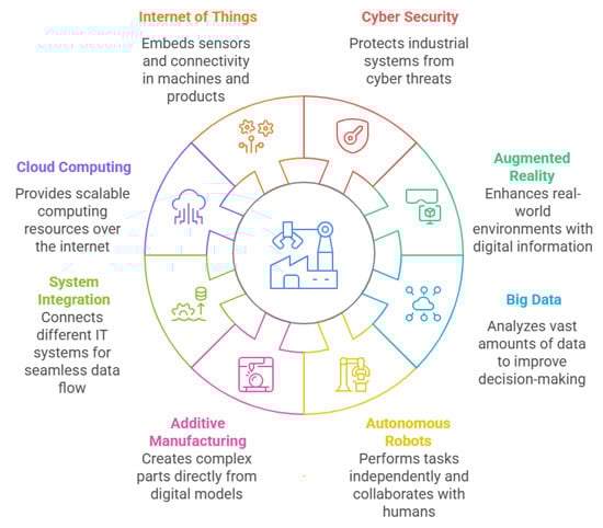 Figure 2 outlines the key pillars driving Industry 4.0, as identified in [16]. The influence of these technologies now extends well beyond traditional industrial settings, shaping home products, business models, clean energy solutions, and broader sustainability efforts—areas that earlier industrial revolutions largely overlooked. As a result, industry is increasingly recognised as a catalyst for systemic transformation, pushing economies toward greater sustainability [17]. Achieving this shift requires the integration of societal and environmental considerations as core priorities within the industrial sector.