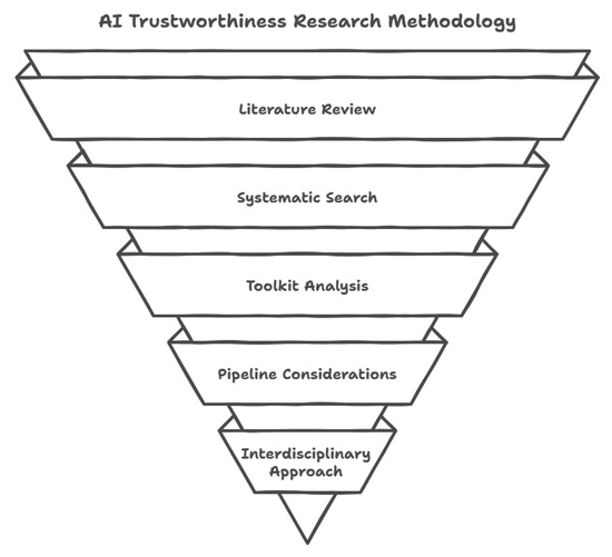 This study adopts a rigorous, multi-stage methodology to systematically investigate the challenges and enablers of AI trustworthiness in manufacturing, particularly within the context of evolving industrial paradigms. The approach highlighted in Figure 5 is designed to ensure both breadth and depth, combining a comprehensive literature review, critical analysis of toolkits, and the use of illustrative case studies to provide a holistic understanding of AI trustworthiness.