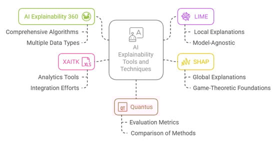 Current methods for ensuring explainability primarily address the needs of developers and designers, aiding in debugging and oversight [99]. However, more suitable approaches are needed to address the needs of non-expert users, bridging the gap between transparency and actual implementation [100]. In this context, the toolkits highlighted in Figure 8 and explained in Table 1 provide a variety of approaches to AI explainability, each designed to tackle different aspects of model transparency. For example, AI Explainability 360 (AIX360) and Local Interpretable Model-agnostic Explanations (LIMEs) focus on providing local explanations and enhancing trust through user-friendly models, which can be particularly helpful for non-expert users who may not have a deep understanding of machine learning. On the other hand, Shapley Additive Explanations (SHAPs) offers both global and local explanations that help users understand feature importance in a more comprehensive manner, which could be useful in settings requiring a higher degree of interpretability.
