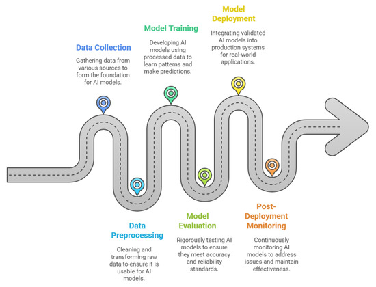 - Security and Cybersecurity: Security concerns are paramount, as AI systems are susceptible to cyber threats that can compromise sensitive industrial data and disrupt operations. For example, adversarial attacks on machine learning models can manipulate outputs or cause system failures. The NIST Cybersecurity Framework and ISO/IEC 27001 provide standards for securing industrial AI systems, but their implementation in dynamic manufacturing environments remains challenging [49,50].