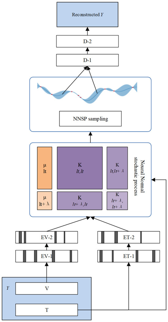As shown in Figure 2, the main structure of NNSP can be divided into three major parts. The first part is the input layer “reconstruction Y” and reconstruction layer “reconstruction Y”, located at both ends of NNSP, responsible for the input and reconstruction of time series information. The second part consists of the encoder EV-X and decoder D-X. They are a pair of fully connected neural networks with symmetrical mirror structures, encoding and decoding time series features, respectively. The third part is the latent space, which uses a Neural Normal Stochastic Process to represent the compressed information output by the encoder as continuous virtual observations. NNSP slides and samples the Neural Normal Stochastic Process according to the query time, obtaining a series of normal distributions related to time semantics. Finally, it samples the normal distribution and passes the sampling results into the decoder for decoding and reconstruction.