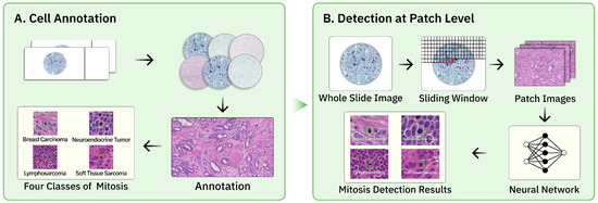 Data collection and training workflow. (A) After digitizing the hematoxylin and eosin (H&E)-stained specimens, pathologists annotate the types of mitosis in different tumors. (B) Using a sliding window, the WSI is cropped into patch-level images, which are then fed into a neural network for training to obtain the final results.