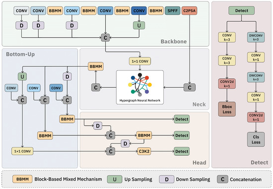 In order to address the limitations of the baseline model in mitosis detection, we propose an enhanced network architecture, which is depicted in Figure 2. Specifically, we introduce a Block-Based Mixed Mechanism (BBMM) within the backbone of the network. This mechanism employs a parallel convolution strategy which is designed to enrich the gradient flow during the training process. As a result, it significantly improves the feature representation at the inter-level, allowing for more robust and detailed extraction of cell features. In the neck of the network, we integrate hypergraph convolution networks. These networks are capable of effectively modeling the relationships between individual cells, thereby facilitating the fusion of heterogeneous visual features at the intra-level. This integration ensures that the network can capture both the individual characteristics of cells as well as their interactions with neighboring cells. Furthermore, in the head of the network, we incorporate a Bottom–Up strategy. This strategy enhances the network’s capability to process cross-hierarchical information, enabling it to better understand the context and structure of cell populations. By jointly leveraging the individual-level cellular attributes and the population-level contextual information, our proposed design produces a high-precision mitosis detection framework. This framework not only improves the representational capacity of the network, but also enhances its structural awareness, making it more effective in mitosis detection with high accuracy and reliability.