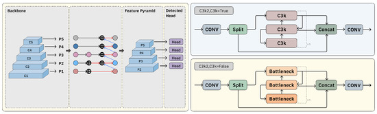 Architecture of the YOLO network modules. The upper part shows the structure of the standard C3K2 module; the lower part shows the Bottleneck module in the proposed Block-Based Mixed Mechanism (BBMM). The redesigned module enhances feature representation and multi-scale fusion capabilities.