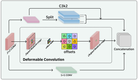 Given the limited feature extraction capability of the C3K2 module, we attribute this limitation to its reliance on a single convolutional mechanism. To address this, we design the Block-Based Mixed Mechanism (BBMM). While retaining the original C3K2 module, BBMM incorporates two additional classic convolutional operations: 1 × 1 convolution and deformable convolution [34], as illustrated in Figure 4. This enhancement aims to enrich the representation of features by introducing both fine-grained channel transformations and adaptive spatial modeling.