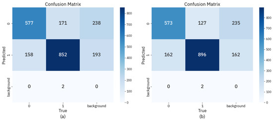 To further visualize the classification effectiveness, we compare the confusion matrices of the baseline model and our proposed approach. These matrices reveal how each model distinguishes between mitotic figures, hard negatives, and background, providing complementary insight to the numerical metrics reported earlier.