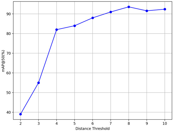 Based on the experimental results, the performance of the proposed network follows a convex curve. As the threshold increases, the detection performance increases rapidly and remains relatively stable with only minor fluctuations in the threshold range of 7 to 10. We attribute this increase to the fact that lower thresholds result in reduced hypergraph connectivity, which does not fully take advantage of the high-order relationships among features. Conversely, higher thresholds connect more hypergraphs, leading to excessive information sharing and over-smoothing of features. This is evident in the performance drop observed when the threshold is set to 9, as shown in the figure. Therefore, our detection network is constructed using a distance threshold of 8.