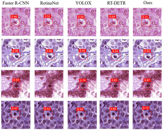 To intuitively demonstrate the accuracy of our model, we selected several representative comparison samples, as shown in Figure 8. Please note that due to the large image sizes, we cropped local regions for better visualization. The number inside each bounding box denotes the confidence score (0–1) output by the corresponding detector for the “mitotic figure” class; the larger the value, the more certain the model is about that prediction. Specifically, we have drawn the following two conclusions: (1) First, among the existing object detection models, the RT-DETR model generally outperforms the others, demonstrating the powerful capabilities of Transformer-based models. (2) Second, our model achieves better detection results than RT-DETR. When dealing with the same mitotic cells, it can display higher confidence levels. Our method successfully identifies subtle lesion patterns that are often missed or misclassified by general-purpose object detection models. Combined with the comparative experiments, this highlights the superior classification accuracy of our model.