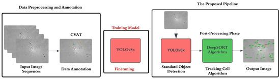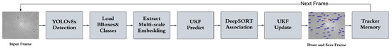 Figure 3 demonstrates a sequential pipeline, commencing with YOLOv8 detection and subsequently employing DeepSORT tracking; nevertheless, the tracking module significantly enhances the overall practical recognition rate. The DeepSORT method, utilizing the Unscented Kalman Filter (UKF), predicts cell positions during transient detection failures or occlusions, therefore reducing persistent missed detections. Additionally, the multi-scale ResNet50 appearance embeddings enhance the accuracy of identity reassociations across frames, ensuring consistent cell trajectories and identities despite intermittent detection inaccuracies. The complementary interplay between detection and tracking improves recognition continuity and resilience during image sequence analysis, even though the workflow is sequential in structure.