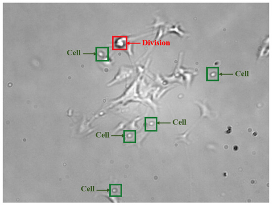 Figure 1. Ground truth labels were assigned to two biologically significant classes: the Cell class, which includes mitotically active cells in motion, and the Division class, comprising cells undergoing prophase or metaphase, often characterized by morphological changes such as increased area prior to cytokinesis. The annotation process was performed by a trained expert and verified by two domain specialists affiliated with the Department of Microbial Biotechnology. Discrepancies were adjudicated through consensus, ensuring high annotation fidelity.