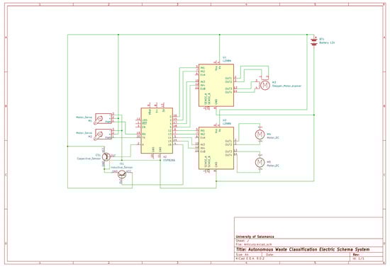 The prototype built for the realization of the case study consists of an automated low-cost bin designed to carry out, in a completely autonomous way, the physical classification of urban solid waste. The system integrates mechanical, electronic, sensorization, and communication components in a closed-loop architecture, aimed at operating without the need for direct human intervention and with operational feedback capacity. Figure 2 shows a diagram of how the components described below are related.