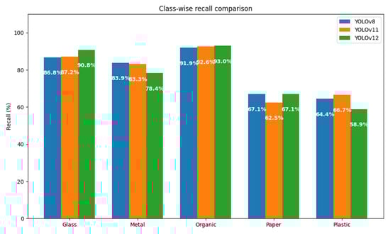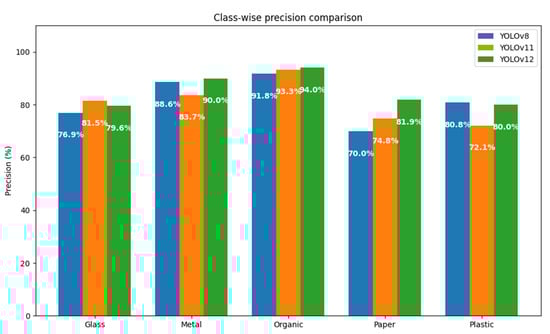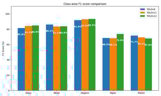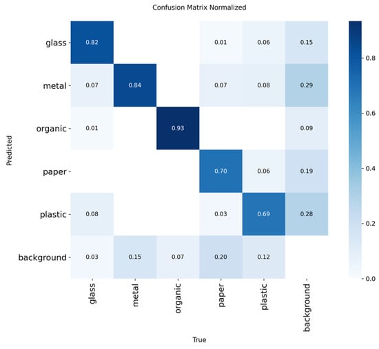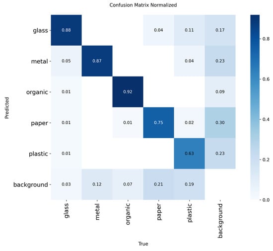 Moreover, although the overall classification results are satisfactory, variable accuracy was observed by class. In particular, categories such as paper or glass presented lower F1 scores than other classes, suggesting that certain types of residues represent specific challenges to the model. These differences may be due to variations in the shape, transparency, or reflectance of the materials, as well as their lower relative presence in the dataset.