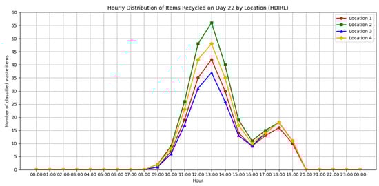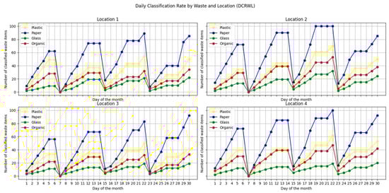 Table 5 shows the results obtained in the automatic detection and classification of recyclable materials, during day 22 of each study, compared to the manual counting carried out in the emptying of the recycler. Data are presented for four different locations and four types of materials: plastic, paper, glass, and organic.